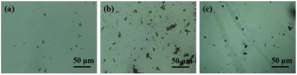 The dispersion state of various fillers in tetrahydrofuran (THF) is investigated by the images of the suspensions at a filler concentration of 0.1 mg/mL. The dispersion solutions were prepared via 72 h sonication and 1 h sedimentation. Then, the prepared solutions were placed on a microscope slide with a syringe to observe under the optical microscope. Figure 2 shows the optical microscopy images of carbon nanomaterials at 500 magnification. There is a trend toward re-agglomeration with the 1 h sedimentation in the suspension. It can be seen that the GnPs-OH (a) homogenously distribute in the suspension, which may be attributed to the interaction between the layers of GnPs-OH from Figure 2a. It is clear that MWCNTs-OH (Figure 2b) show a severe aggregate phenomenon. The forming of aggregates is ascribed to the micrograph of hybrid material suspension. Compared to the GnPs-OH and MWCNTs-OH, the hybrid material suspension shows more homogenously dispersed aggregates and a smaller cluster size. Therefore, Figure 2 provides more evidence to prove that the dispersion of hybrid materials is superior to the GnPs-OH and MWCNTs-OH. In the hybrid materials system, with the 1D MWCNTs bridging adjacent 2D GnPs, GnPs may provide steric and electrostatic stabilization, preventing CNT re-agglomeration for their large surface area and space hindrance. Therefore, the hybrid filler is more prone to form a loosely packed 3D nanoparticle network in the solvent [15]. Moreover, the GnPs-OH and MWCNTs-OH are linked by the bridge (PACl, polypropylene acyl chloride), and the bridge could inhibit aggregation of GnPs-OH and MWCNTs-OH.