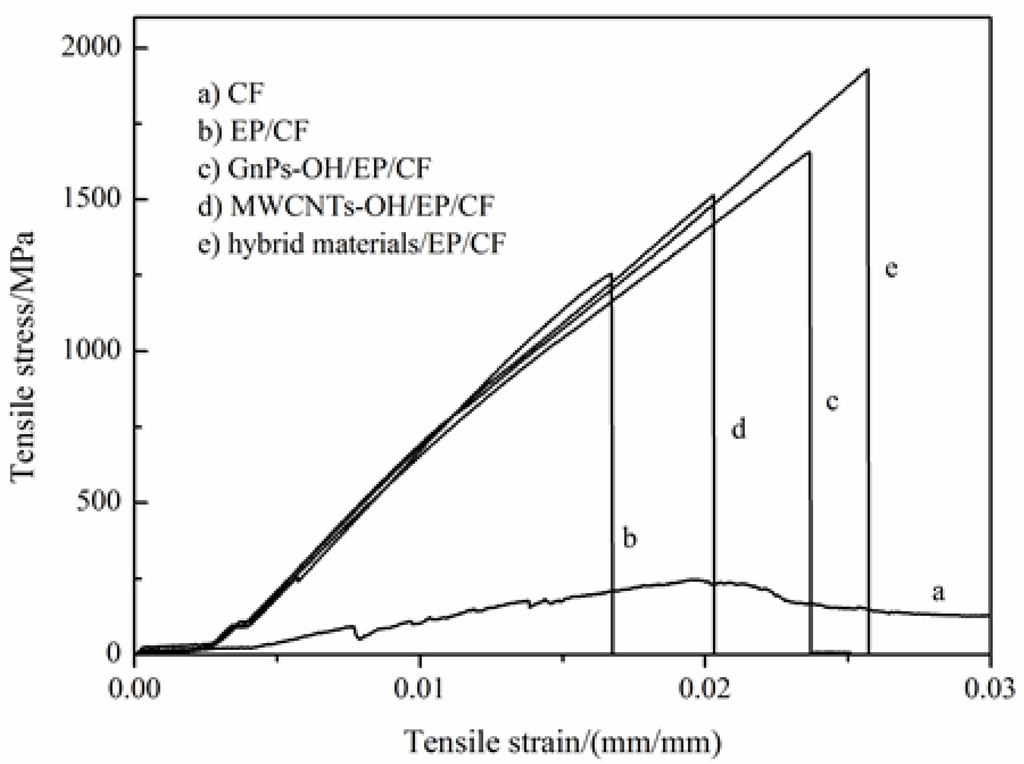 The tensile properties comparison of carbon fiber (CF) and epoxy composites (a) epoxy resin (EP)/CF; (b) GnPs-OH/EP/CF; (c) MWCNTs-OH/EP/CF; (d) hybrid materials/EP/CF.