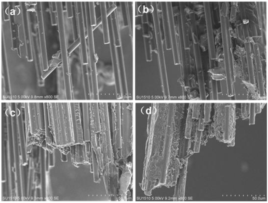 Figure 10 shows the scanning electron microscopy (SEM) images of the fracture surface of the CF composites modified by EP composites. The fracture surface of fiber is smooth without massive epoxy, shows in Figure 10a (CF modified by pure EP). The fibers “pulled out” from the matrix represent the poor interface interaction between CFs and the epoxy matrix. The fiber surface attaches small MWCNTs-OH and epoxy composites shown in Figure 10b, while Figure 10c (CF, GnPs-OH, and epoxy composites) shows more attachment. As for the CF modified by hybrid materials/epoxy composites (Figure 10d), the CF are wrapped with the resin composites; they would not separate from one another when the external mechanical forces added. The phenomenon proves the strong interface interaction between the fibers, and the hybrid materials and epoxy composite. The good interface interaction is actually due to the hybrid materials distributed in the epoxy composites homogeneously. These hybrid nanoparticles with a stable three-dimensional structure are proposed to be a “buffer” that could bear external load and avoid stress concentration in the stretching process, while glomerate MWCNTs may lead to a concentration of stress.