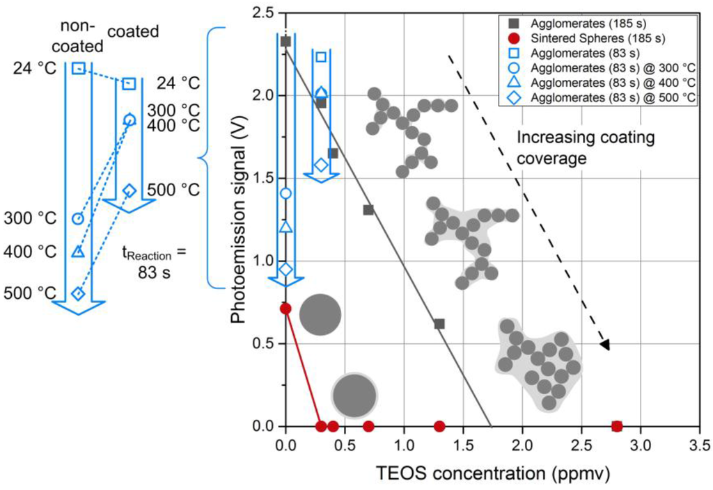 In order to follow the coating kinetics, photoemission measurements were done for Pt agglomerates as well as spheres as a function of the precursor concentration (Figure 12). The non-coated agglomerates (cTEOS = 0) gave the highest signal corresponding to the largest amount of active surface area. Uncoated sintered spheres gave a smaller signal due to a reduced particle surface area, a consequence of particle losses (number concentration) and surface loss due to sintering. For the spheres, a small amount of TEOS is sufficient to obtain a complete coating, reflected in a rapid drop of the APE signal. Higher precursor concentrations increased the coating thickness, but even a small, hermetic coating was enough to prevent photoemission. Agglomerates, however, behaved differently in the way that coating was favored in the necks and the gaps between branches, leaving some outer particles exposed. The fraction of the uncoated primary particles contributing to the APE signal decreased with increasing TEOS concentration. At high TEOS concentrations the whole agglomerate was covered. Parallel to the complete coating of the agglomerates a restructuring of some branches to more compact structures was observed due to capillary forces. Such a compactization of nanoparticle agglomerates is well documented in the literature [31]. However, at lower precursor concentrations, restructuring did not occur. This observation raises the question if the mere coating of the necks would lead to mechanical stabilization against restructuring without hindering mass transport processes, which would enable interesting applications such as catalysis at higher temperatures.