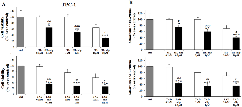 Nanoliposomes containing PDE5 inhibitors reduced proliferation of TPC-1 cells. After 24 h of treatment, proliferation was evaluated by cell count assay (A) and MTT assay (B), as described in Materials and Methods. Results are mean ± SD of three experiments performed in triplicate. *, **, ***, p < 0.05, 0.01, 0.001 vs. control (ctrl); °, °°, °°°, SIL-nlip vs SIL; #, ##, ###, p < 0.05, 0.01, 0.001 TAD-nlip vs. TAD.
