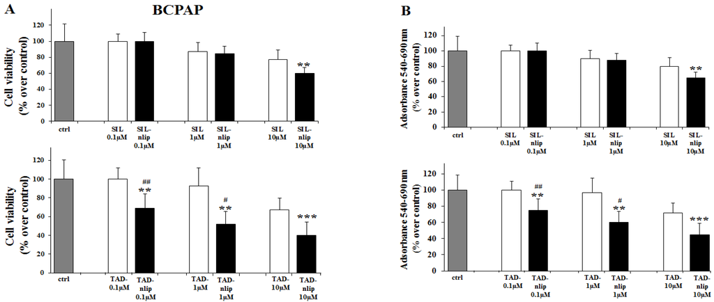 The effects of SIL and TAD on the proliferation of TPC-1 and BCPAP were first evaluated by cell counting, comparing the free drugs with the molecules encapsulated in the nanovesicular carrier. As shown in Figure 3 and Figure 4, we observed a slight decrease in TPC-1 and BCPAP cells treated for 24 h with SIL and TAD at a concentration of 10 µM. When the drugs were encapsulated, a significant effect on the proliferation was observed even at 0.1 µM in TPC-1 cells compared to both the control (SIL-nlip p < 0.05; TAD-nlip p < 0.001) and the free drug (SIL-nlip p < 0.01; TAD-nlip p < 0.01), while in BCPAP a much more significant reduction of cell growth appeared only with TAD encapsulated in nanoliposomes at a concentration of 0.1 µM (p < 0.01) (Figure 4A). Similar results were observed with the MTT assay (Figure 3B and Figure 4B). It can be hypothesized that a specific genetic background (in particular, BRAF V600E mutation in BCPAP) had made the cells more or less resistant to the action of the free drugs, even to the point of influencing their response to the different inhibitors. In this regard, it was thanks to drug encapsulation that a significant antiproliferative effect could be observed in both cell lines treated with both inhibitors.
