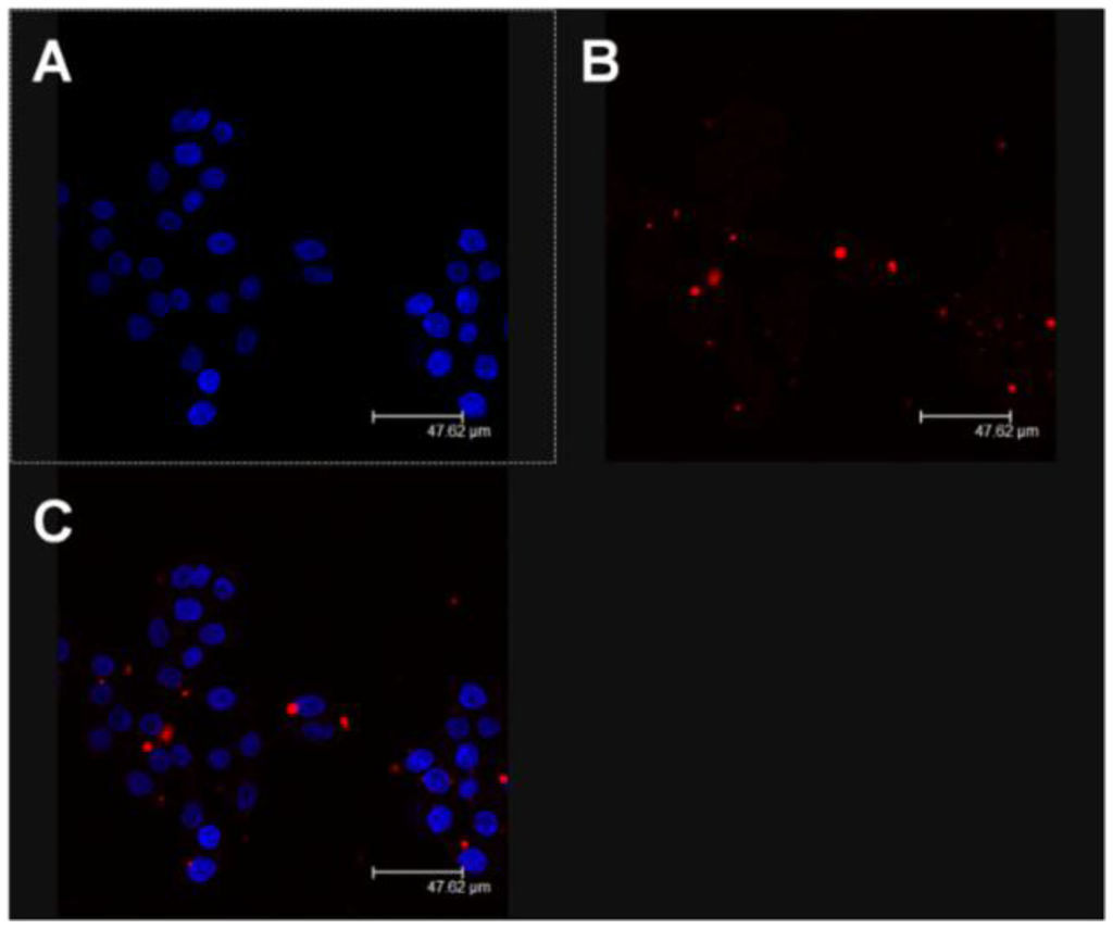 Confocal laser scanning microscopy (CLSM) micrographs of TPC-1 cells treated with rhodamine-labelled nanoliposomes after 3 h incubation: panel A, Hoechst filter; panel B, TRITC filter; and panel C, overlay. A representative example of three independent experiments.