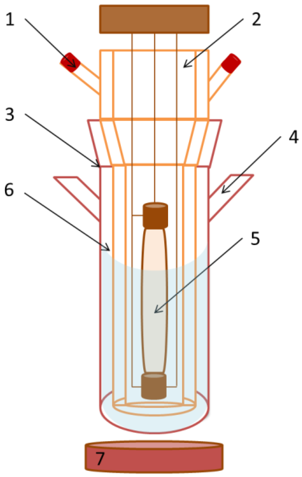 Reaction system: (1) lamp cooling system; (2) double-walled immersion well reactor; (3) photoreactor; (4) port for taking samples; (5) 125 W ultraviolet (UV) lamp; (6) mother solution; and (7) magnetic stirrer.