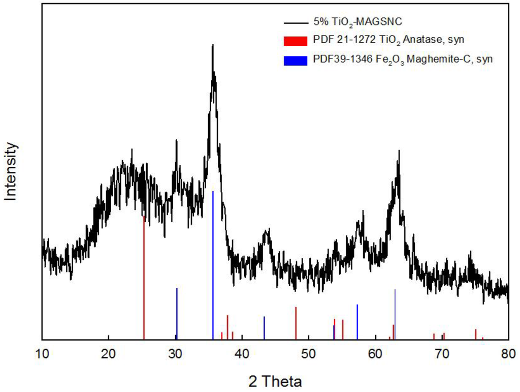 XRD analysis was performed to investigate the crystal phase of the synthesized TiO2-MAGSNC nanocomposites. The XRD pattern of a representative sample (5% TiO2-MAGSNC) is shown in Figure 2 The mean observed peaks (2θ = 35.6°) could be assigned to the presence of a magnetic phase (in principle γ-Fe2O3, although the presence of a magnetite phase cannot be completely ruled out) while titania peaks were not obvious due to the low titanium loading on the supports; hence, particle size could not be worked out from these data. By applying the Scherrer equation, iron oxide nanoparticle sizes can be calculated to be ca. 14 nm. Results from XRD pattern also suggested that our simple mechanochemical protocol can successfully lead to the formation of magnetically-separable nanocomposites, as further supported with subsequent characterization techniques.