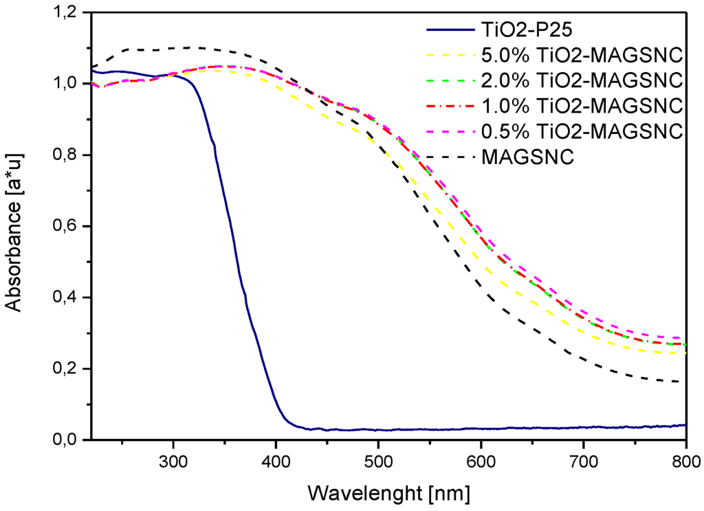 Diffuse reflectance (DR) UV-VIS spectroscopy was used to record the optical properties of the samples. UV-VIS adsorption spectra of TiO2-MAGSNC samples are shown in Figure 4, which showed extensions of absorption band into the visible region for all catalysts. Significant enhancement of light absorption of all samples was achieved at a wavelength of around 700 nm, when comparing to those of pure commercial TiO2 (P25, 386 nm). The extension of light absorption of the synthesized catalysts into the visible range was probably resulting from the presence of the photocatalytic composite, iron oxide phase, on the MAGSNC supports. As a result of the extension of light absorption into the visible light range, better utilization of the abundant solar energy might be possible.