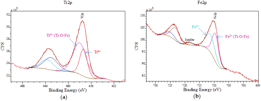In order to analyze the chemical states of the prepared samples, XPS spectra were also recorded. Figure 5a depicts binding energies (BEs) of ca. 463.3 and 457.5 eV for Ti 2p3/2 and Ti 2p1/2, respectively, characteristic of the Ti4+ cation with a 5.8 eV spin orbit splitting. The fitting peak with higher binding energy arises from the Ti4+ species in a Ti–O–Fe structure. Electrons can be induced by transfer from Ti4+ to Fe3+ in the Ti–O–Fe bond due to the electronegativity difference between Ti4+ (1.54) and Fe3+ (1.83), which makes Ti4+ species potentially less electron-rich (and Fe3+ more electron-rich), resulting in the increase of BE for Ti4+ species and decrease of BE for Fe3+ [36]. Peaks at a binding energy of 723.8 (Fe 2p1/2) and 710.2 eV (Fe 2p3/2) also correlated well to typical signals of Fe3+ from Fe 2p in Figure 5b, which confirmed the presence of such species in the nanocomposites, in good agreement with XRD results. Despite the stability of the hematite phase (as most thermodynamically stable at temperature over 300 °C), the magnetic phase was still well preserved after calcination at 400 °C. Most importantly, the absence of any Fe2+ species on the external surface in all catalysts can be confirmed from XPS spectra (Figure 5).