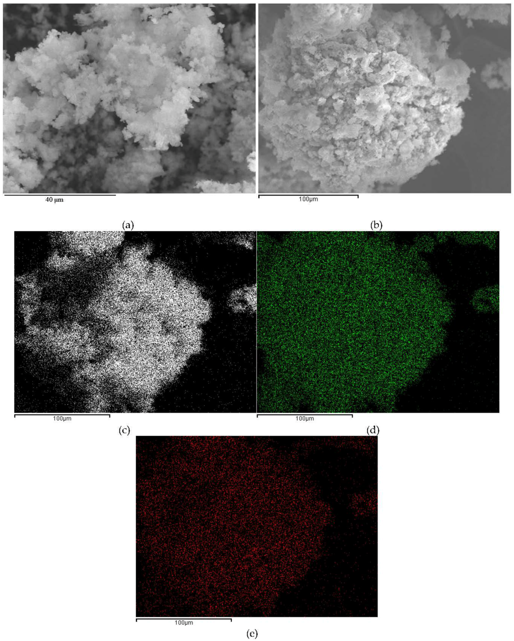 Scanning electron microscopy images were recorded with a JEOL JSM-6300 scanning microscope (JEOL Ltd., Akishima, Tokyo, Japan) equipped with Energy-dispersive X-ray spectroscopy (EDX) at 20 kV. An Au/Pd coating was employed to analyze samples on a high-resolution sputtering SC7640 instrument (Quorum Technologies Ltd., Lewes, England, UK) (up to 7 nm thickness) at a sputtering rate of 1.5 kV per minute.