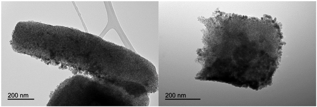 Both scanning electron microscopy (SEM) and TEM images of the catalysts were in good agreement with the textural properties and characterization results of the mesoporous nanocomposites (Figure 6 and Figure 7). Element mapping illustrated for 2% TiO2-MAGSNC pointed out that both Ti4+ and Fe3+ were homogeneously distributed on the supports, in line with analogous observations for the other catalysts. Particularly, the fully preserved SBA-15 structure could be visualized in TEM micrographs of the final photocatalytic nanomaterials, with small nanoparticles (ca. average nanoparticle size 10 nm), in good agreement with XRD results. Titania nanoparticles could not be distinguished from TEM images, in line with XRD data, which may again relate to a very high dispersion of TiO2 in the nanocomposites at such low loadings. Results of EDX analysis have been summarized on Table 2, showing a good agreement in terms of Ti content on the catalysts with respect to the theoretical Ti content selected. These findings confirm the excellent incorporation of Ti provided by the proposed mechanochemical approach.