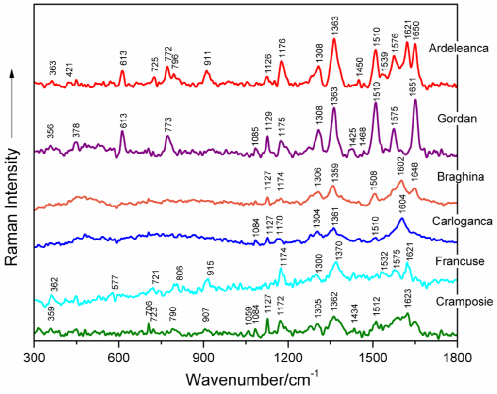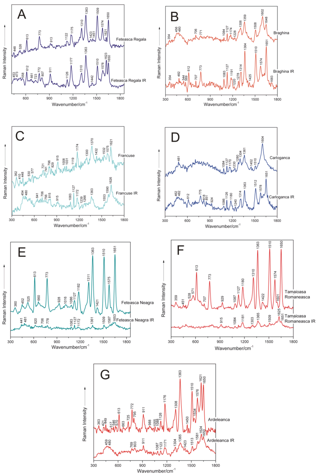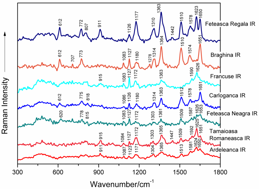 Surface-enhanced Raman spectral characteristics of seven genomic DNAs isolated from leaves of different grapevine varieties (Feteasca Regala, Braghina, Francuse, Carloganca, Feteasca Neagra, Tamaioasa Romaneasca, Ardeleanca) that were exhibiting a SERS signal after IR irradiation (1100 nm) are presented in Figure 3 between 300 and 1800 cm−1.