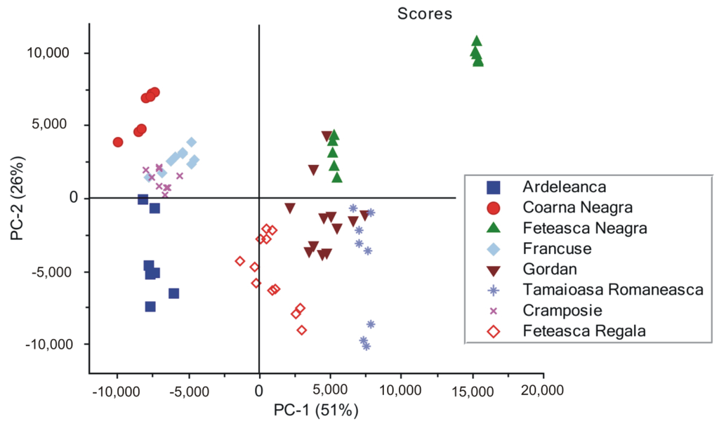 In addition, using unbiased computational resources by means of principal component analysis (PCA), eight grapevine varieties were discriminated.