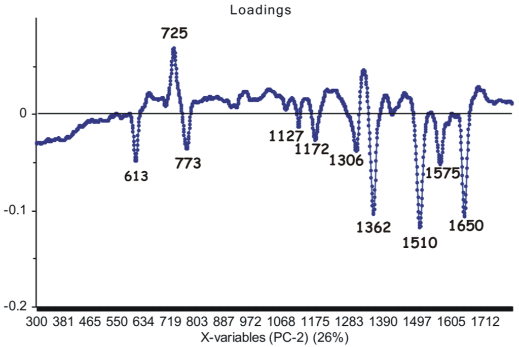 Second principal component (PC2) loadings showing the marker bands considered as the main contribution (26% explained by the PCA model) in the grouping of the spectral data.