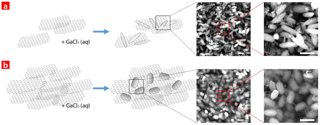 Schematic illustrations of hybrid composite (HC) growth depending on (a) a 4% graphene oxide (GO) solution and (b) a 10% GO solution. The scale bar in the scanning electron microscopy (SEM) is 1 μm.