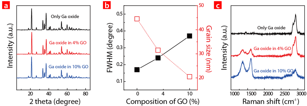 In addition, the full-width at half maximum (FWHM) of {110} was measured, and the grain size of the structures was extracted from the FWHM at different GO concentrations [17]. The GaO grain size of 45 nm continued to decrease as the GO concentration increased in the HC. It was presumed that the functional groups such as hydroxyl, epoxide, carbonyl and carboxyl at the GO surface can serve as nucleation sites. Accordingly, there should be more nucleation sites for the GaO when there is a higher GO concentration because this leads to a smaller GaO grain size in an HC [18]. This reveals that the presence of GO during the Ga oxide formation affects the grain size of the Ga oxide in a nano scale range. The crystallinity of the HC was further investigated via Raman analyses, as shown in Figure 2c. The results show that the peaks representing GaO were observed in the GaO particles. As the GO concentration increased in the HC, the GO peak became more prominent. D-band (D) occurs at 1350 region because of oxide. The G-band (G) is generated at 1350 region because of graphite [17]. The D/G ratio of the GO peak in the HC was comparable to that of a conventional GO. The results show that high quality GO was preserved even in the GO in the HC.