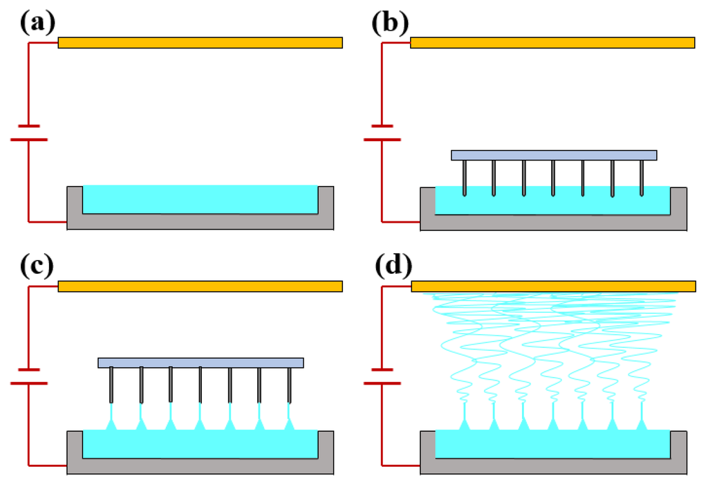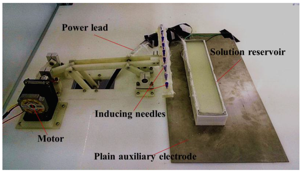 - Wang, X.; Niu, H.; Lin, T.; Wang, X. Needleless electrospinning of nanofibers with a conical wire coil. Polym. Eng. Sci. 2009, 49, 1582–1586. [Google Scholar] [CrossRef]