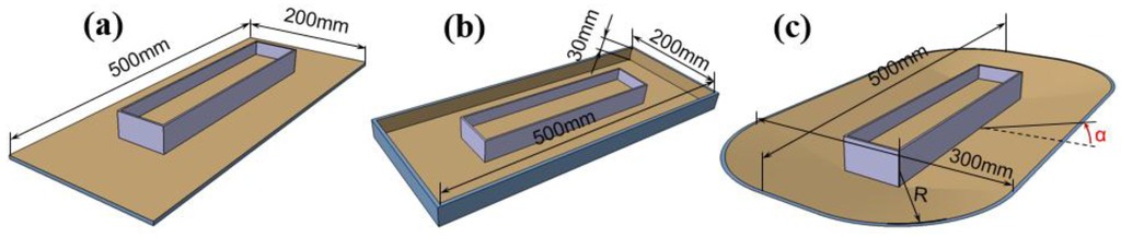 The Tip-Induced Electrospinning process is presented in Figure 1a–d, in which tips are dipped into polymer solution and withdrawn quickly. Then Taylor cones can be formed from the solution surface where the tips left because of the adhesion of the polymer solution to the tips. After the tips move away, jets will come into being easily from the top of the Taylor cones with the help of the electric field force. The jets during the TIE process often travel to the surrounding area. Therefore, different shapes of auxiliary electrodes were designed to change the electric field nearby to control the trajectory of the jets, and the uniformity of the electric field was simulated by commercial FEA software to optimize the structure. The geometries of the FEA models were built according to the experimental setup and three different shapes of additional conductive electrode structures are shown in Figure 2. In all simulations, a voltage of 40 kV was applied to the metallic solution reservoir and the auxiliary electrode, and the collector was connected to the ground earth.