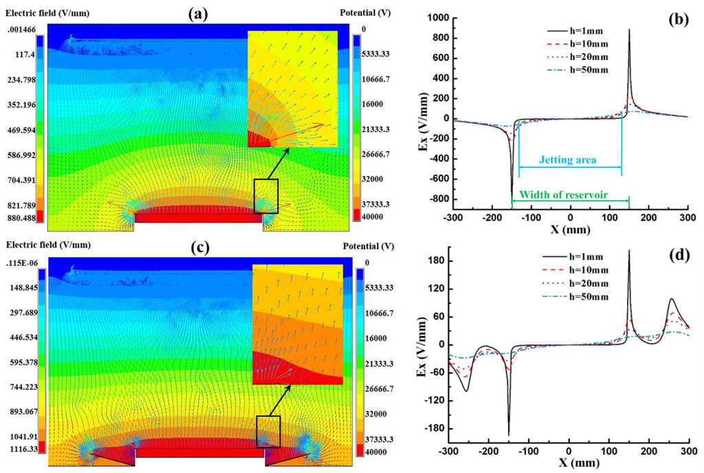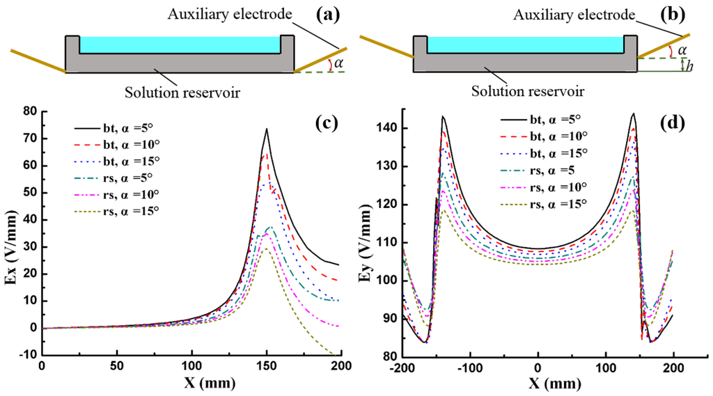 Since the auxiliary electrode has been proved to be effective in improving the distribution of the electric field, different shapes were designed and optimized to achieve the most uniform electric field. The electric field is expected to have a smaller x component (Ex) and a more uniform y component (Ey). Considering that the jetting area (from –120 mm to 120 mm along the x-axis) near the solution of the real setup is smaller than the width of the reservoir (from –150 mm to 150 mm along the x-axis), the Ex caused by the electric edge effect at a lower height (as shown Figure 3d, h = 1 mm, black curves) is nearly zero in the jetting area. Although the jetting area grows larger with the increasing height, the Ex also becomes too weak to influence the jets. So the electric field at h = 10 mm was chosen to evaluate the electric field uniformity in different conditions.