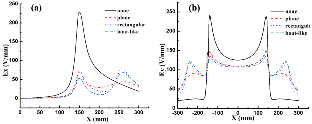 In view of the symmetry of the model, the electric field distribution in the positive direction was enough to express all the information about the electric field strength. Ex and Ey caused by different shapes are described in Figure 4. The simulation results illustrated that the maximum Ex value was 229 V/mm, 74 V/mm, 70 V/mm and 53 V/mm for the TIE without the auxiliary electrode and with plain, rectangular and boat-like electrodes, respectively. It is obvious that the boat-like electrode resulted in a smaller Ex and a more uniform Ey distribution at 10 mm above the solution surface (near the first peak). The plain auxiliary electrode causes a smaller Ex beside the reservoir (the second peak), but it has little influence on the jets because this area is away from the jets’ trajectory. Thus, a boat-like auxiliary electrode is considered a better choice if only the electric field is considered.