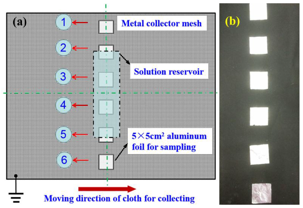 As seen in Figure 6, the TIE setup consists of a collector (not shown), an inducing component, a high-voltage source (only power lead was shown), a solution reservoir and an auxiliary electrode. The collector was composed of a grounded metal mesh, a long cloth to collect nanofibers and a winding device to realize continuous movement of the cloth. The inducing component contains a bar with arrayed inducing needles, which was driven by a motor through the crank and a bar linkage. The solution reservoir consists of a metal sheet and a plastic shell. Thereinto, the solution reservoir was 300 mm in length and 60 mm in width and the plastic shell was 20 mm in depth. The anode and cathode of the high voltage source (ES80P-20W/DDPM, Gamma, Ormond Beach, FL, USA) were respectively connected to the solution reservoir and the grounded metallic mesh. There are 13 inducing needles with 0.295 mm in diameter and 20 mm gap distance between needles along the inducing bar. Due to the continuous deposition in large-scale production process, the moving direction of the collector is perpendicular to the length of solution reservoir and the deposition uniformity of nanofibers does not need to be considered. In order to evaluate the deposition uniformity, as illustrated in Figure 7a, six 5 cm × 5 cm aluminum foils were evenly attached onto the collector, which width is 60 cm, in a line to receive PEO nanofibers. And Figure 7b shows the real arrangement of the collector belt.