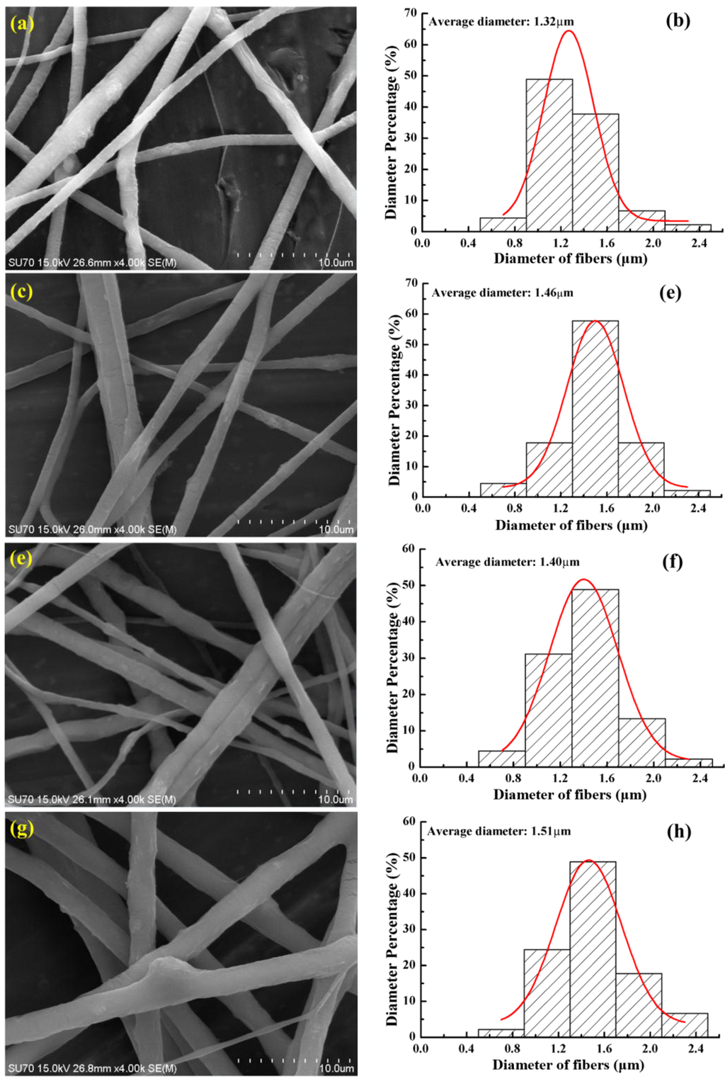 Scanning electron microscope (SEM) images and diameter distributions of poly (ethylene oxide) (PEO) fibers fabricated by TIE with different structures of the additional metal electrode: (a,b) none, (c,d) plain, (e,f) rectangular circle, (g,h) boat-like.