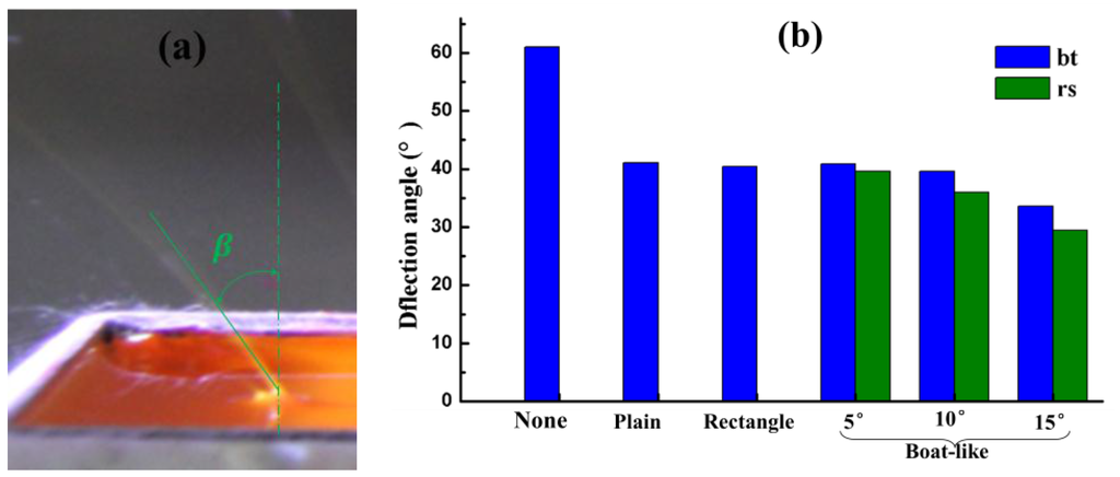 (a) The optical photograph of a typical deflection angle; (b) the deflection angle with respect to different shapes and positions of auxiliary metal electrodes.
