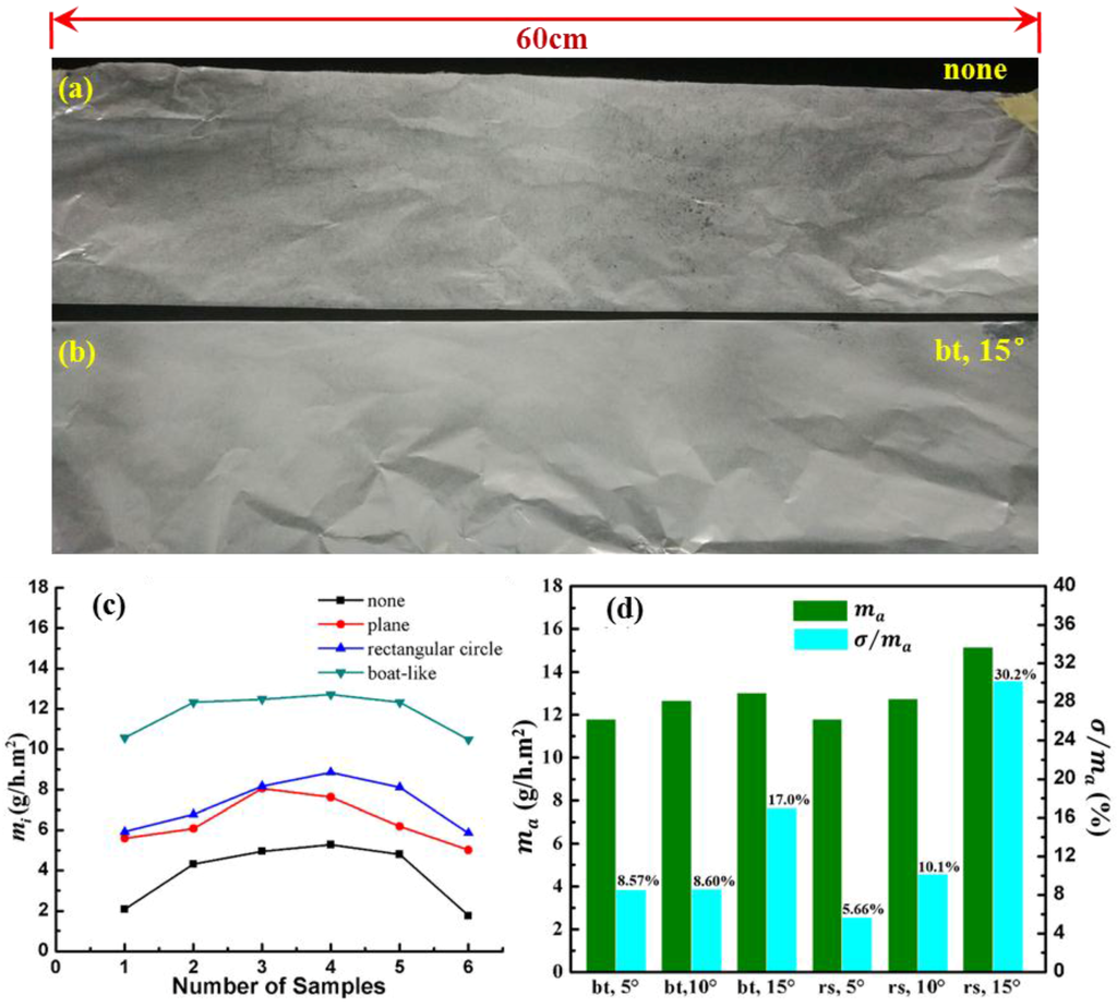 Uniformity of deposition. We aim to find out the best way to improve the deposition uniformity of nanofibers. In order to examine whether it works in a real situation, all the fibers from TIE with no electrode or a boat-like electrode with a 15° tilted angle were shown in Figure 10a,b, respectively, which presented that the auxiliary electrode can effectively improve the deposition uniformity. To investigate the deposition uniformity from TIE with different auxiliary electrodes quantitatively, six pieces of 5 cm × 5 cm aluminum foils were attached onto the collector as shown in Figure 7 along the X-axis. Then the mass of nanofibers deposited on these samples within 15 min was measured to evaluate the uniformity of the deposition. The samples would contact the surface of an Al plate to release the static charges before being weighed in. The standard deviation of the mass of nanofibers on these samples was calculated by the following equation: