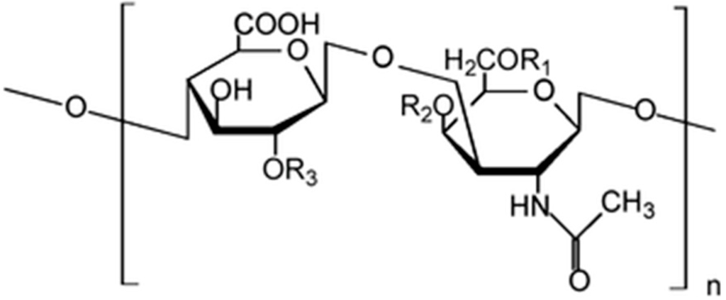 Chemical structure of chondroitin-4-sulfate, where R1 = H; R2 = SO3H; R3 = H.
