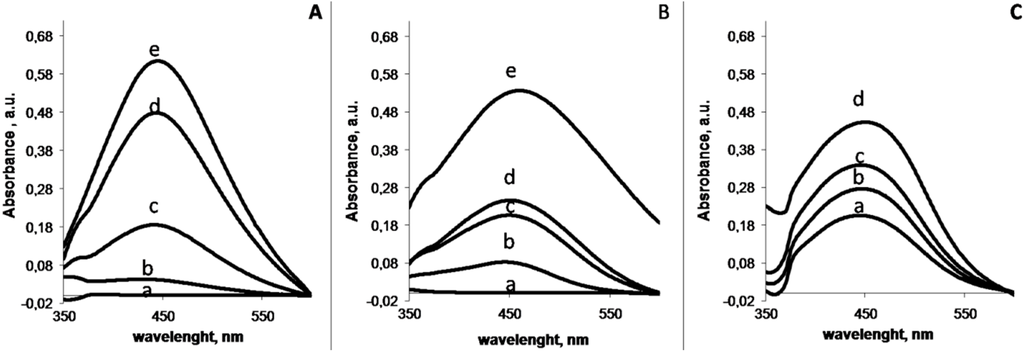 UV-Vis spectra of silver-containing chondroitin sulphate solutions (CS 10 wt. % and 0.16 mM AgNO3) after thermal treatment at 80 °C (A) and 90 °C (B) and UV-treatment (C). Thermal treatments were performed over 0, 90, 120, 210 and 270 min (lines a, b, c, d and e, respectively). UV treatments were performed over 120, 180 and 240 min (lines a, b and c). Sample irradiated during 240 min rested 24 h before measuring the exciton peak (line d).