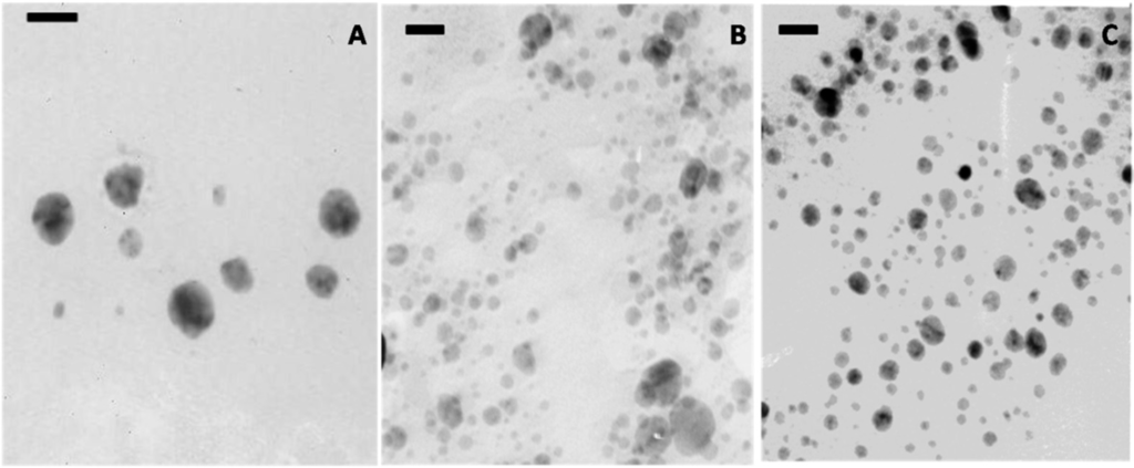 Transmission electron microscopy (TEM) micrographs of AgNPs-CS produced by thermal treatment at 80 °C (A); UV irradiation of fresh sample (B); and sample rested for 24 h (C). Bars are 50 nm in panel (A) and 20 nm in panels (B) and (C). CS: chondroitin sulfate.