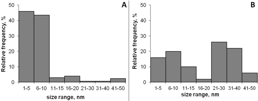 Transmission electron microscopy (TEM) micrographs were used to determine the AgNPs’ size distribution; at least 100 AgNPs were analyzed using Image J software. As seen in Figure 4, more than 90% of the AgNPs produced by UV irradiation had a particle size lower than 10 nm while the AgNPs produced by thermal treatment (80 °C) had a bimodal distribution with particle sizes centered in the range of 1–10 nm and 20–40 nm, respectively.
