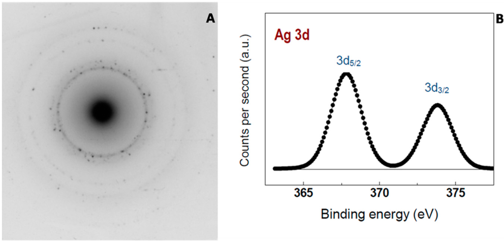The metallic nature of the AgNPs was corroborated by selected-area electron diffraction (SAED) and X-ray photoelectron spectroscopy (XPS) (Figure 5). The corresponding SAED pattern showed the main diffraction rings that can be assigned as (111), (200), (220) and (311) reflections, which corresponds to the face-centered cubic structure of metallic silver. Moreover, the XPS analysis revealed the presence of Ag 3d5/2 and Ag 3d3/2 doublet peaks typical of metallic silver at binding energies of 367.8 and 373.8 eV, respectively, with a spin-orbit separation of 6.0 eV. The yield of the reduction process was around 100% since no Ag+ was detected.