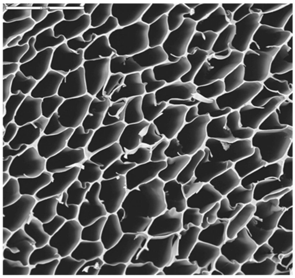 As confirmed by Scanning electron microscopy (SEM), the resulting crosslinked scaffold exhibited a uniform and porous 3D structure along the whole scaffold, with a pore size range between 10 and 30 μm (Figure 6). The Ag content within the scaffolds was 287 ± 13 µg of Ag per gram of polymer.