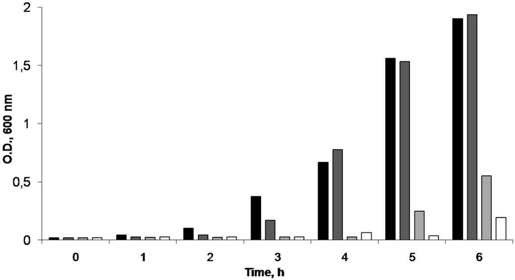 E. coli growth inhibition for different Ag concentrations. Ag 0 ppm (■); Ag 1.32 ppm (); Ag 3.76 ppm (); Ag 6.26 ppm (□).
