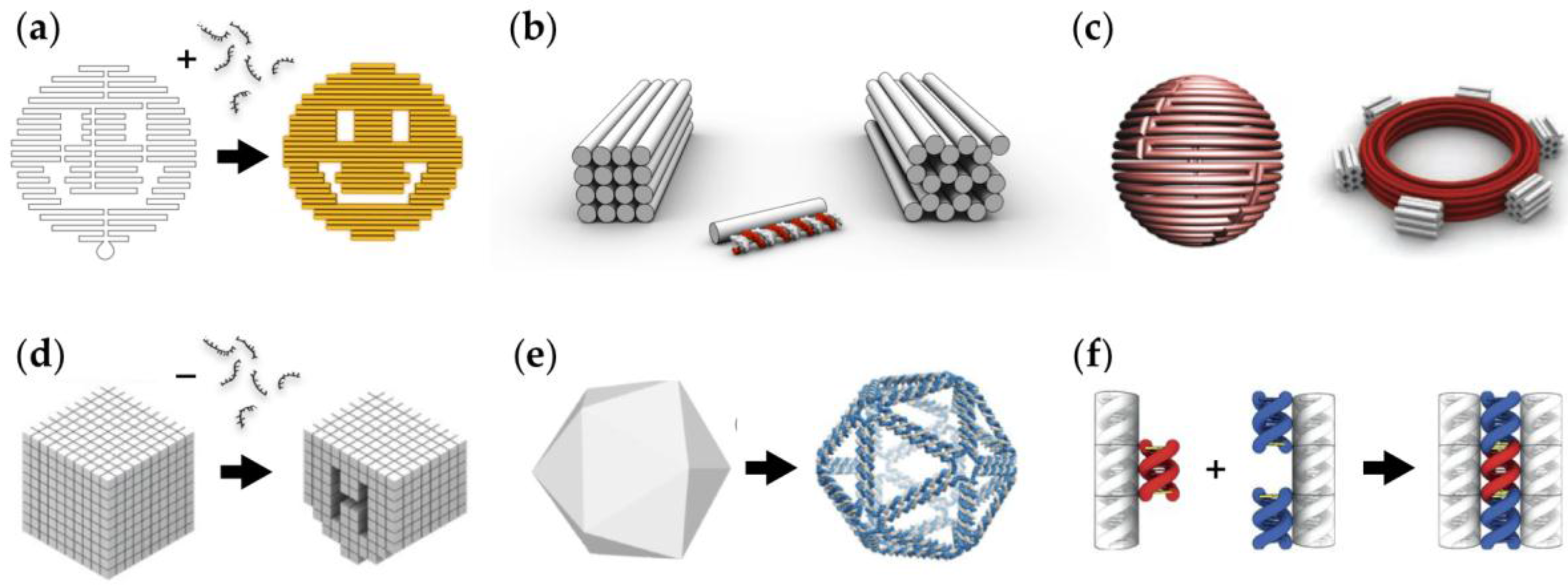 Nadrian ‘Ned’ Seeman postulated around 30 years ago that deoxyribose (DNA) molecules could be used as building material in creating complex predesigned nanostructures through molecular self-assembly [10]; sequence-complementary parts of single-stranded DNA (ssDNA) molecules can be hybridized into double-stranded DNA (dsDNA) domains (via Watson-Crick base-pairing) and therefore into larger programmed shapes. Since then, structural DNA nanotechnology has enjoyed a rapid progress; numerous complex nanostructures and different fabrication techniques have been introduced [11] (Figure 2). A great deal of the first compelling DNA assemblies were based on tile-like structures that enabled fabrication of two-dimensional (2D) [12] and three-dimensional (3D) crystals [13], but nevertheless, the huge upturn in the field was the invention of the ‘DNA origami’ technique [14] (Figure 2a). The origami approach is based on folding a long single-stranded DNA scaffold strand into a desired shape with the help of a set of short oligonucleotides (staples), and it has now become a widely accessible and exploited method to fabricate custom, modular and spatially-well-defined 2D [14] and 3D nanostructures with complex curvatures, bends and twists [15,16,17,18] (see Figure 2b,c). Later on, methods based on scaffold-free fabrication [19] (Figure 2d), polyhedral rendering [20,21] (Figure 2e) and shape-complementarity [22] (Figure 2f) were introduced.