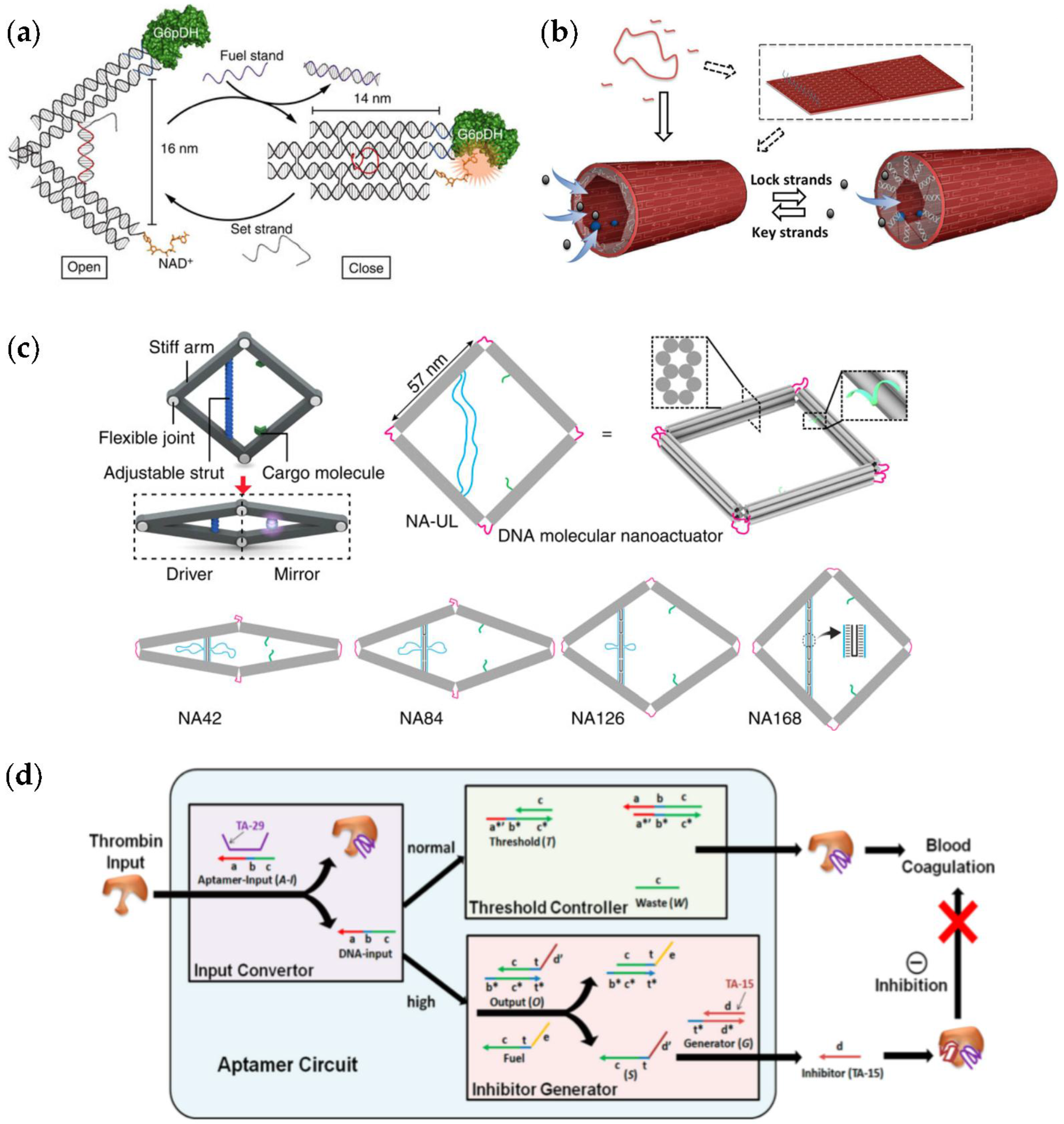 (a) Nanotweezers to regulate enzyme activity [49]; (b) Tubular nanoreactor with switchable lid to control the flowthrough of the reaction compounds [53]; (c) DNA origami nanoactuator that can be driven by, e.g., single-stranded DNA (ssDNA) strands or restriction enzymes [54]; (d) Aptamer-based logical molecular circuit to control thrombin activity [55]. (a) is reproduced with permission from [49] Copyright Nature Publishing Group, 2013. (b) is reproduced with permission from [53]. Copyright The Royal Society of Chemistry, 2016. (c) is reproduced with permission from [54]. Published by Nature Publishing Group, 2016. (d) is reproduced with permission from [55]. Copyright American Chemical Society, 2012.