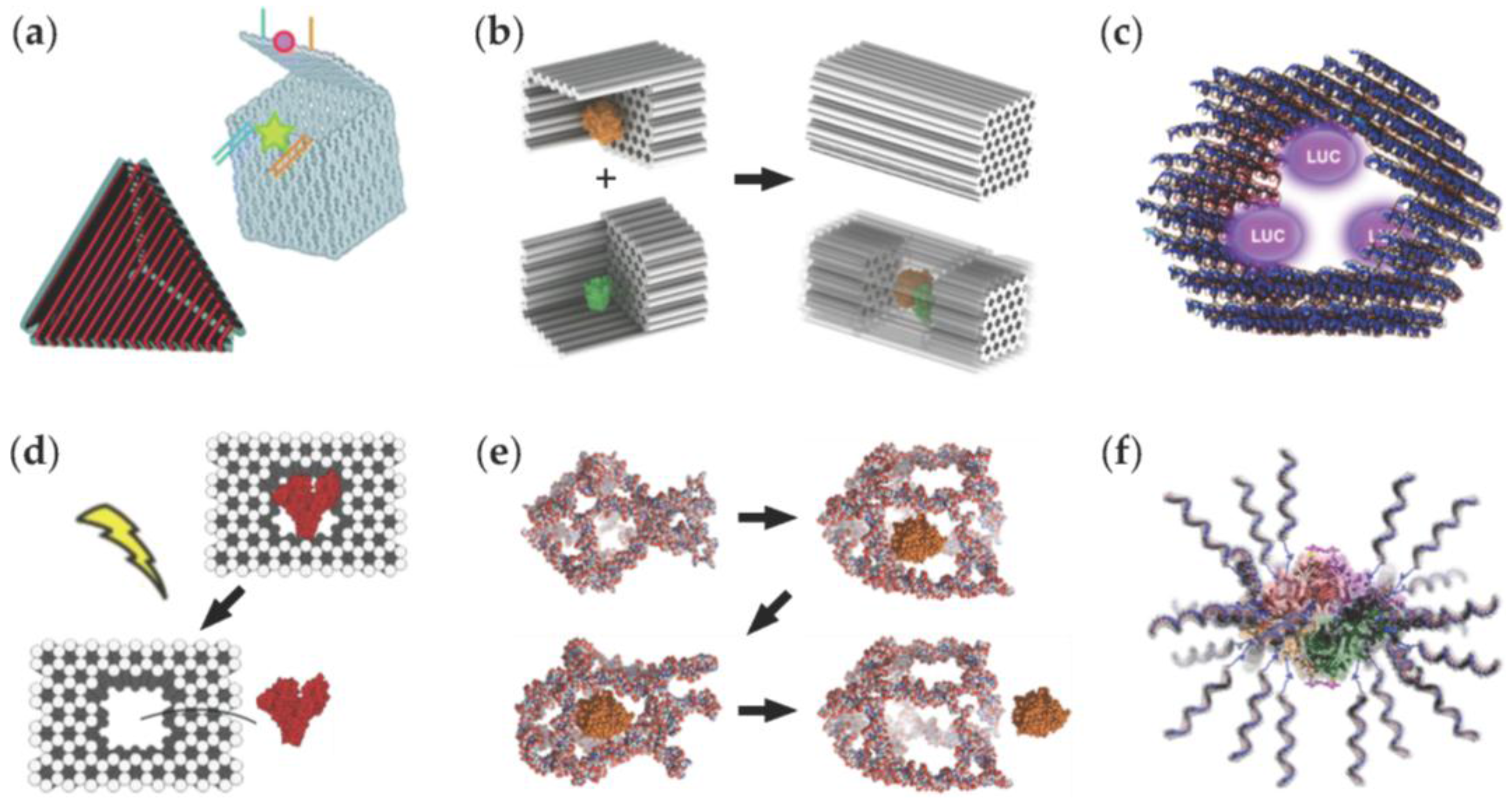 Juul et al. [62] developed a preassembled DNA cage that can encapsulate and release enzymes by temperature-induced conformational changes in the assembly (illustrated in Figure 5e). The cage-like structure was assembled using 12 DNA duplexes that formed the edges of the design. In between the double-stranded domains, there were short ssDNA linkers that made up five cage corners, but the one corner was composed of four 32-nt-long stretches of DNA possessing a sequence that enables hairpin-formation. The hairpin structure was formed only below 22 °C (the annealing temperature of the hairpin-forming sequences), and thus it allowed temperature-controlled switching between the open and closed states. It was demonstrated that the HRP enzyme could enter or exit the cage at 37 °C, but it stayed trapped in the cage when the temperature was lowered to 4 °C (four different states depicted in Figure 4e). In addition, Juul et al. studied if the DNA cage could improve the cellular uptake of HRP enzymes. However, it was observed that the cellular uptake was facilitated only in the presence of Lipofectamine® transfection agent.