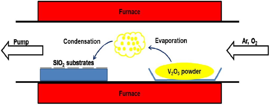 V2O5 nanowires were fabricated on silicon substrates, a commercial item with a growth plane of (100), by thermal evaporation. Good quality 0.5 g V2O5 powders (Alfa, purity 99.5%, 325 mesh, Heysham, Lancashire, UK) and several silicon substrates were situated in an aluminum oxide (Al2O3) boat, and then the Al2O3 boat was placed in the heating area of a quartz tube, as illustrated in Figure 1. These substrates employed in this experiment are commercial silicon wafers of (001). In advance, The Si substrates were prepared without chemical etchings or physical damage, but were cleaned ultrasonically in acetone. During the growth of V2O5 nanowires, the pressure inside the quartz tube was maintained at 0.5 Torr by a rotary pump. The working parameters of this process were as follows: (1) Increasing the working temperature to 800 °C with 26 °C/min was at a continual flow rate of 30 sccm Ar gas; (2) Maintaining the temperature at 800 °C for 1 h was at a constant flow rate of combined gas of 30 sccm Ar and 30 sccm O2; (3) Cooling to the room temperature was under a constant flow rate of 30 sccm of Ar gas.
