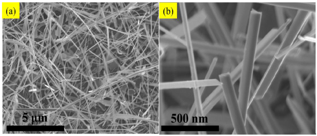 Figure 2. (a) Scanning electron microscope (SEM) image of V2O5 nanowires; (b) Enlarged SEM image of V2O5 nanowires.