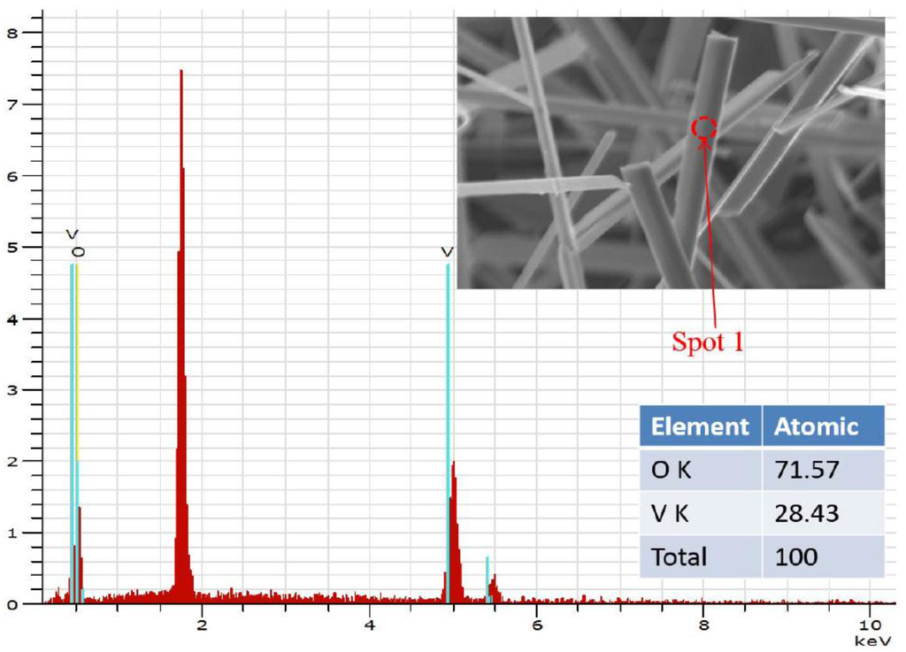 Figure 3. Energy-dispersive X-ray spectrometer (EDS) analysis at spot 1 of V2O5 nanowires. Inset: SEM image of spot 1.