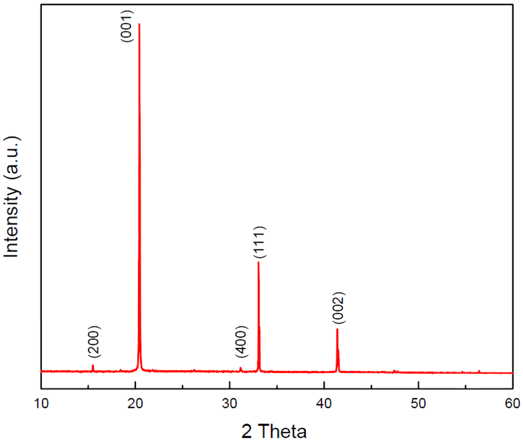 The morphology, crystal structure and chemical composition of the V2O5 nanowires were analyzed by a field emission scanning electron microscope (FESEM, Zeiss, SIGMA Essential, Jena, Germany), a high-resolution transmission electron microscope (HRTEM, JEOL, JEM-2010, Tokyo, Japan), a MAC glancing incident X-ray spectrometer with an incident angle of 0.5° (PANalytical, Almelo, The Netherlands), and energy-dispersive X-ray spectroscopy (EDS, Bruker, Hanau, Germany), respectively. Regarding the optical property of V2O5 nanowires, the measurement via PL (RENISHAW inVia, Wotton-under-Edge, UK) at room temperature under an irradiation (λ = 325 nm, 20 W/m2) of wavelength from 300 to 800 nm was undertaken. As for the electronic property of single V2O5 nanowire, the sample with regard to the electronic measurement was prepared by dual-beam focused ion beam system (FIB, FEI Helios Nanolab 600i System, Hillsboro, OR, USA), then the I-V curve was characterized between −3 V and 3 V by Keithley 4200 (Solon, OH, USA).