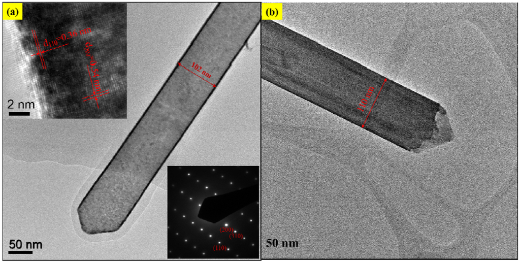 Figure 5. (a,b)Transmission electron microscope (TEM) images of a V2O5 nanowire. Upper left inset of (a): high-resolution transmission electron microscope (HRTEM) image. Lower right inset of (a): selected-area-electron-diffraction (SAED) pattern.