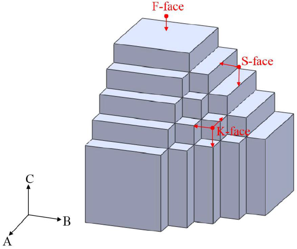 Figure 6. Schematic diagram illustrating the periodic bond chain (PBC) theory. Flat surfaces (F-face) with one PBC penetrate {100} planes. Stepped surfaces (S-face), {110} planes, own two PBCs. Kinked surfaces (K-face), {111} planes, have three PBCs.