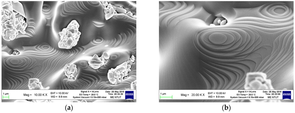 Figure 7 shows the SEM images of the sample synthesized at the commencement of V growth species into V2O5 crystal nanostructures, which presents a step-line self-intersecting appearance, thus nucleating an island. Figure 7a,b is very similar to Figure 6, when the growth mechanism is the screw dislocation on the S-face in a SCC. Herein, this result provides clear proof to verify that the crystal growth of V2O5 nanowires is in accordance with the PBC theory. This theory denotes that the V2O5 nanowires grow along the {110} direction in VS process, so screw dislocations are required for the continued growth on a {110} surface that belongs to an S-face in PBC theory.