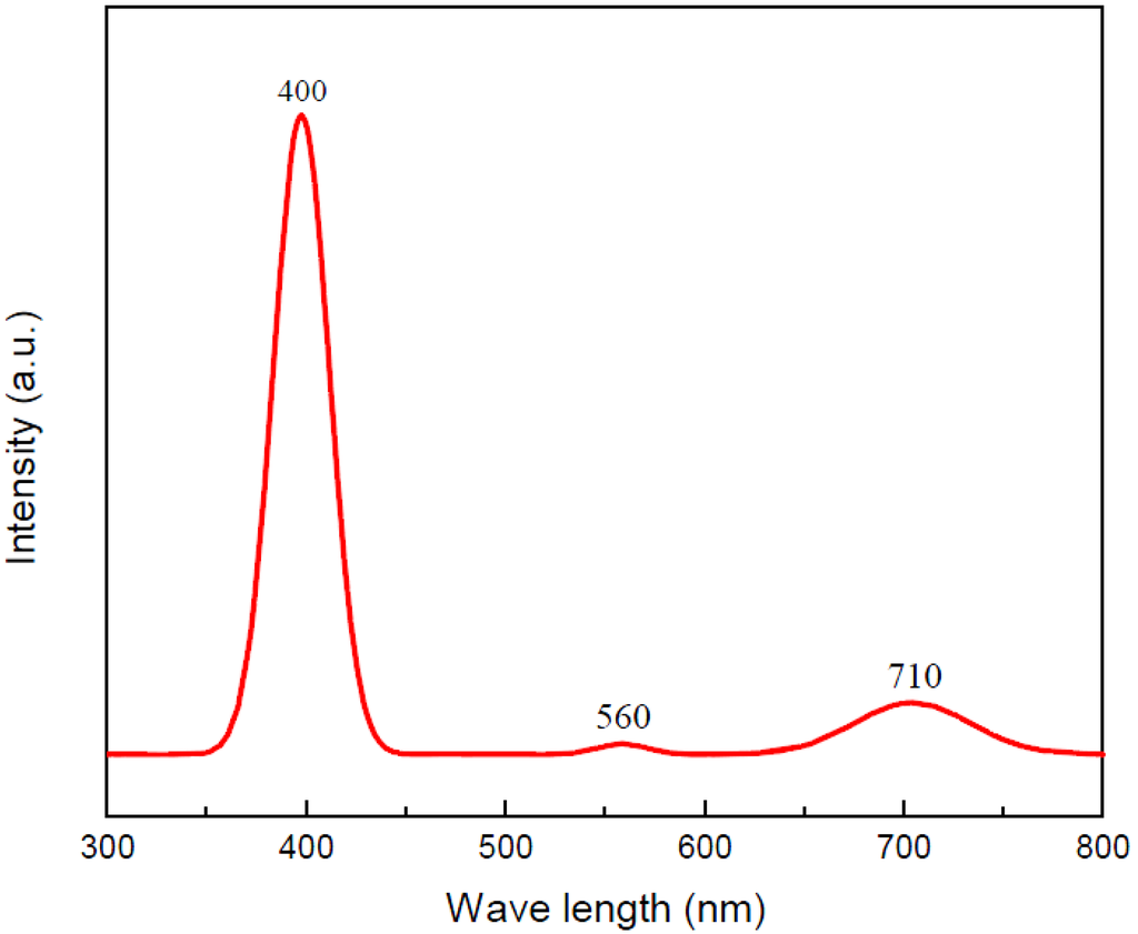 In order to evaluate the optical property, as depicted in Figure 8, the PL spectrum of V2O5 nanowires is recorded from 300 to 800 nm in the scale of wavelength at room temperature. Three luminescence peaks display the correspondence between the locations at 400, 560 and 710 nm and the photon energies approximated to 3.00, 2.21 and 1.75 eV, respectively. From the previous studies [19,28], the PL emission peaks located at 400 and 560 nm belong to intrinsic transition. Owing to the recombination of electron-hole pair from the bottom of the V 3d conduction band to the top of the O 2p valance band, the intensity of the PL spectrum is centered at 400 nm. The recombination of electron-hole pair from the V 3d split-off conduction band to the top of O 2p valence band causes the PL spectrum to peak at 560 nm. The light emission excited at 710 nm of PL spectrum belongs to extrinsic transition, which is derived from the recombination from the lowest defect donor band to the O 2p valence band. Generally, the defects are oxygen vacancies in V2O5 nanowires. According to the published papers [29,30], orthorhombic crystalline structure of V2O5 is composed of layers of VO5 square pyramids and these VO5 square pyramids regularly link at edges or corners. Additionally, the layers of V-O atoms connect the layers of O atoms in alternate layers along the c-axis. Because the bonding force is an electrostatic force in each layer, formations of oxygen vacancies are done spontaneously in the O layer between the nearest V-O layers in the (001) plane.