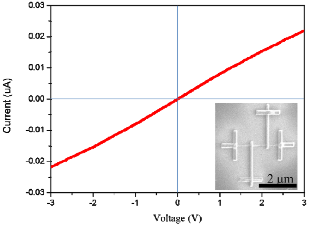 Figure 9 demonstrates the measured current-voltage (I-V) curve of a single V2O5 nanowire, which has been measured by the four-point method. Under both the positive and negative bias of 3 V, the I-V characteristic curve shows an almost linear result and indicates a good Ohmic contact between the nanowire and four platinum electrodes. Moreover, the electrical resistivity ( ρ ) could be expressed as