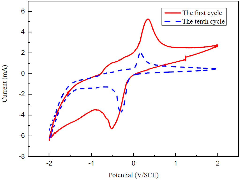 For investigating the electrochemical property of V2O5 nanowires, the CV technique was used to measure the voltages of oxidation peak and reduction peak [31,32]. The typical cyclic voltammetric curve of V2O5 nanowires in 2 M KCl solution at the scan rate of 50 m·Vs−1 at room temperature is plotted in Figure 10. The CV was performed at a potential between −2 V and 2 V. The red CV curve recorded at the first cycle reveals that the reduction peak is located at −0.521 V and the oxidation peak is at 0.340 V, so the potential difference between these two peaks is 0.861 V. The blue dash curve recorded during the 10th cycle shows that the reduction peak is located at −0.308 V and the oxidation peak is at 0.162 V. The potential differences of the red and blue curves are 0.861 V and 0.470 V, respectively. According to these two CV curves, although the CV curve recorded during the 10th cycle becomes small compared with the red curve, the electrochemical performance and reversibility after 10 cycles still remain a good achievement, indicating that using V2O5 nanowires as a cathode is efficient in discharge-charge processes.