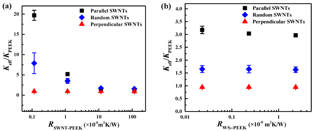 Effects of the interfacial thermal resistances at (a) SWNT-PEEK and (b) WS2-PEEK interfaces on the Keff of SWNT/WS2/PEEK composites. The 0.5/0.5/99.0 composition was used for this quantitative study. The models with different SWNT orientation (e.g., SWNTs parallel to the heat flux, SWNTs randomly orientated to the heat flux, and SWNTs perpendicular to the heat flux) were built to study the effect of SWNT orientations. The error bars represent the standard deviation of the results from 3 separate simulations with different distribution of SWNTs. Reproduced with permission from [18]. Copyright Elsevier, 2014.