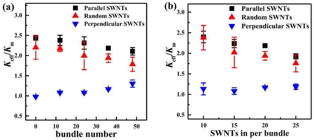 The number of individual SWNTs in each bundle was varied from 10 to 25, at an increment of 5, to study its influence on the Keff of the composites. The total number of SWNTs (960) and the number of SWNT bundles (36) were kept constant. As shown in Figure 5b, when SWNT bundles are parallel or randomly oriented relative to the heat flux, more SWNTs in each bundle induce a lower Keff. With the same number of bundles, more SWNTs per bundle lead to a worse distribution of SWNTs, which may reduce the heat transfer along the heat flux. On the other hand, more SWNTs in a bundle increase the stiffness of the bundle, which weakens the phonon coupling between SWNTs and PEEK via low-frequency vibrations [55], thus leading to a larger SWNT-PEEK thermal resistance [56]. When SWNT bundles are perpendicular to the heat flux, the number of SWNTs in each bundle has no apparent effect on the Keff of the composites.