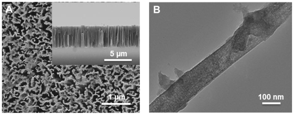 p-type planar silicon (resistivity 10–20 mΩ·cm) was etched by means of the MACE technique with 10 min of etching time. Figure 1A show a representative top-view scanning electron microscopy (SEM) image of etched SiNWs sample (10 min) and the inset show the corresponding cross-sectional view. The length of the SiNWs was measured to be approximately 4 µm. Figure 1B shows the transmission electron microscopy (TEM) image of an individual SiNW with a diameter of approximately 120 nm.