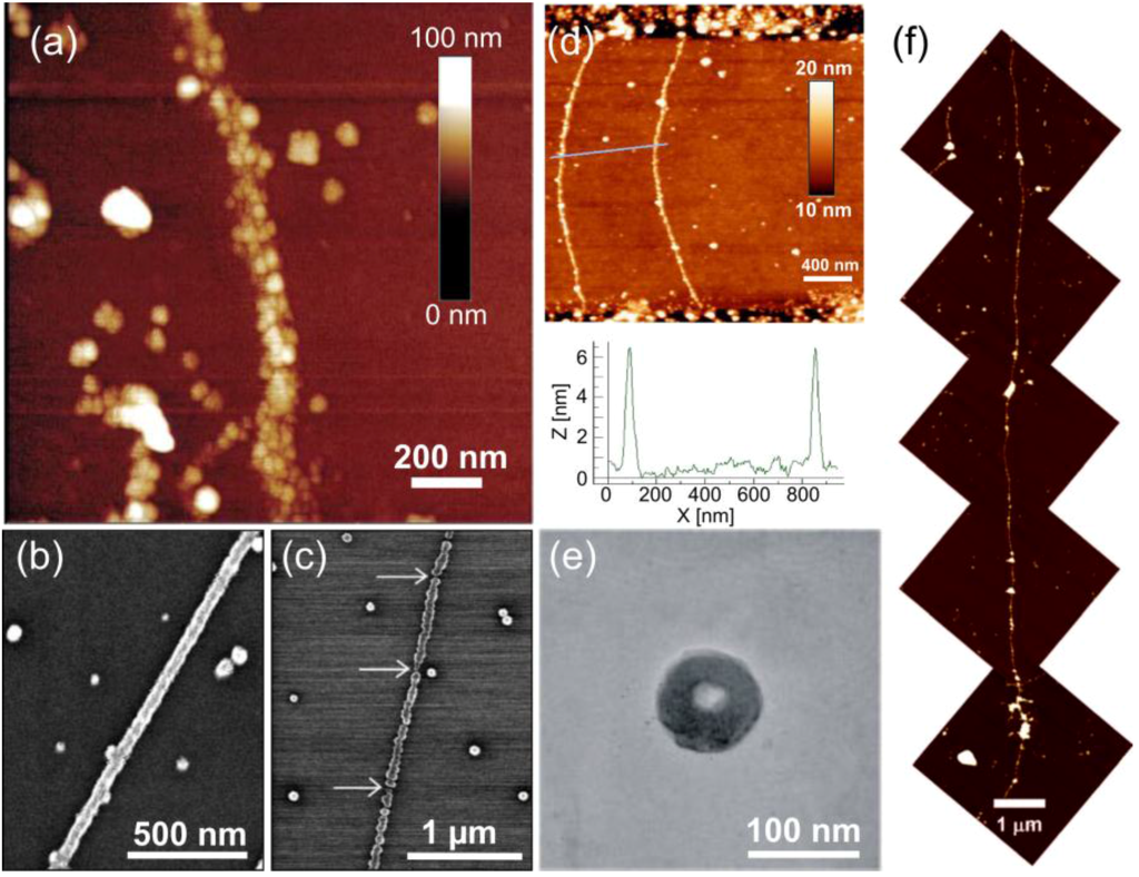 (a) Atomic force microscope (AFM) image of silver nanowires [65]; (b) continuous Pd nanowires using a 42-h incubation time and a 45 °C temperature [69]; (c) when lowering the incubation time to 20 h, but using the same temperature, discontinuous Pd nanowires were formed [69]; (d) continuous Pt nanowires formed by UV photoexcitation [83]; (e) silver toroids formed by reducing silver salt on spermine treated ssDNA [77]; (f) long Ni nanowires on lambda-DNA [72]. (a) is reproduced with permission from [65]. Copyright Nature Publishing Group, 1998; (b,c) are reproduced with permission from [69]. Copyright John Wiley and Sons, 1998; (d) is reproduced with permission from [83]. Copyright Elsevier, 2009; (e) is reproduced with permission from [77]. Copyright American Chemical Society, 2005; (f) is reproduced with permission from [72]. Copyright American Chemical Society, 2006.
